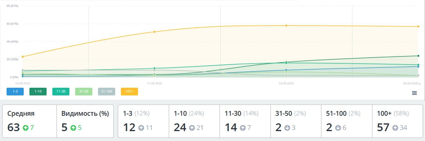 - Видимость в ТОП-10: +17% (рост с 7% до 24% по ключевым запросам)