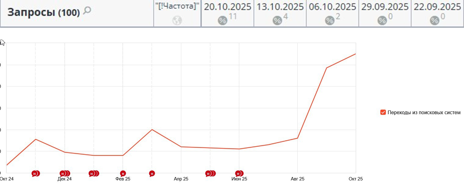 Посещаемость из поисковых систем увеличилась в 4 раза, что подтвердило эффективность проведённых изменений.